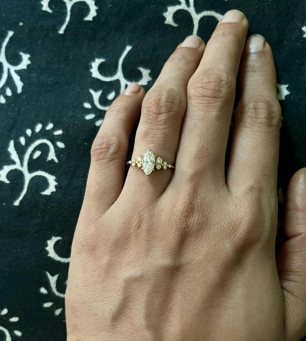 I catch myself looking at my finger all throughout the day! The ring is beautifully crafted, the design is unique and it sparkles like a dream. Extremely happy with my purchase!